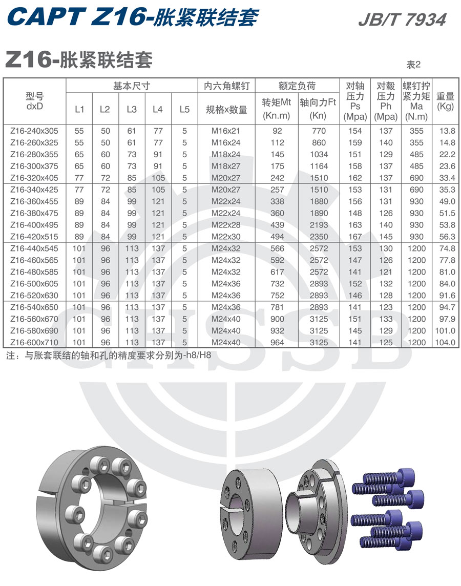 分布均勻,安裝拆卸容易。Z16型脹套是Z15型脹套的變形,內環的法蘭盤外圓為臺階狀,有一大于脹套工作直徑的凸